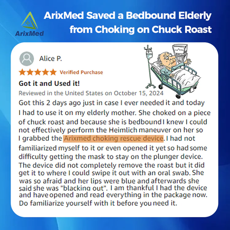 For caregivers of elderly or bedbound loved ones, choking presents a particularly frightening challenge. The limitations of performing the Heimlich maneuver in such situations can make these emergencies feel even more helpless. On October 15, 2024, Alice P. shared how the ArixMed Choking Rescue Device helped her save her mother during a choking incident: